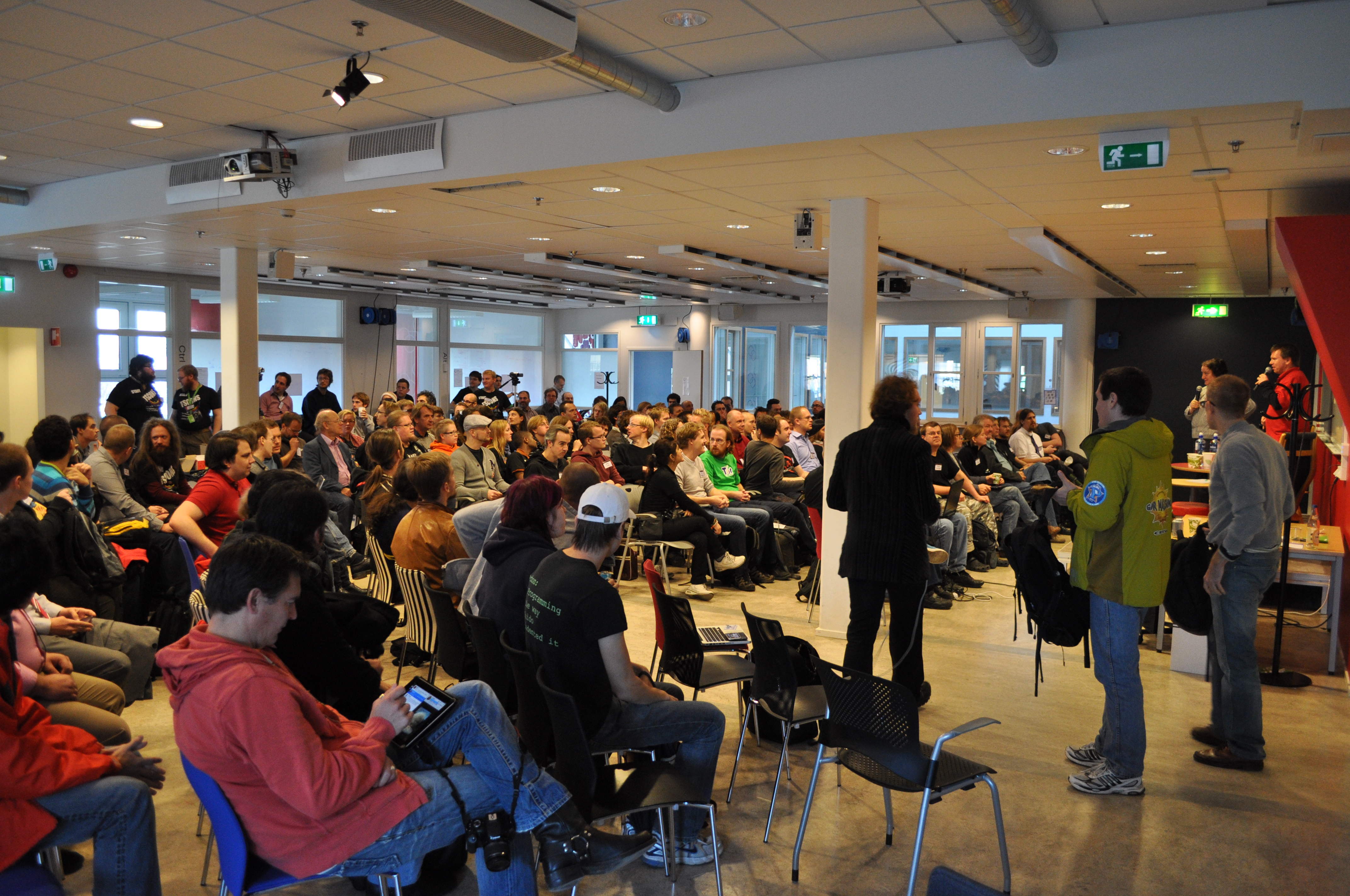 FSCONS-deltagare bänkar sig för att höra på en intervju med Richard Stallman.