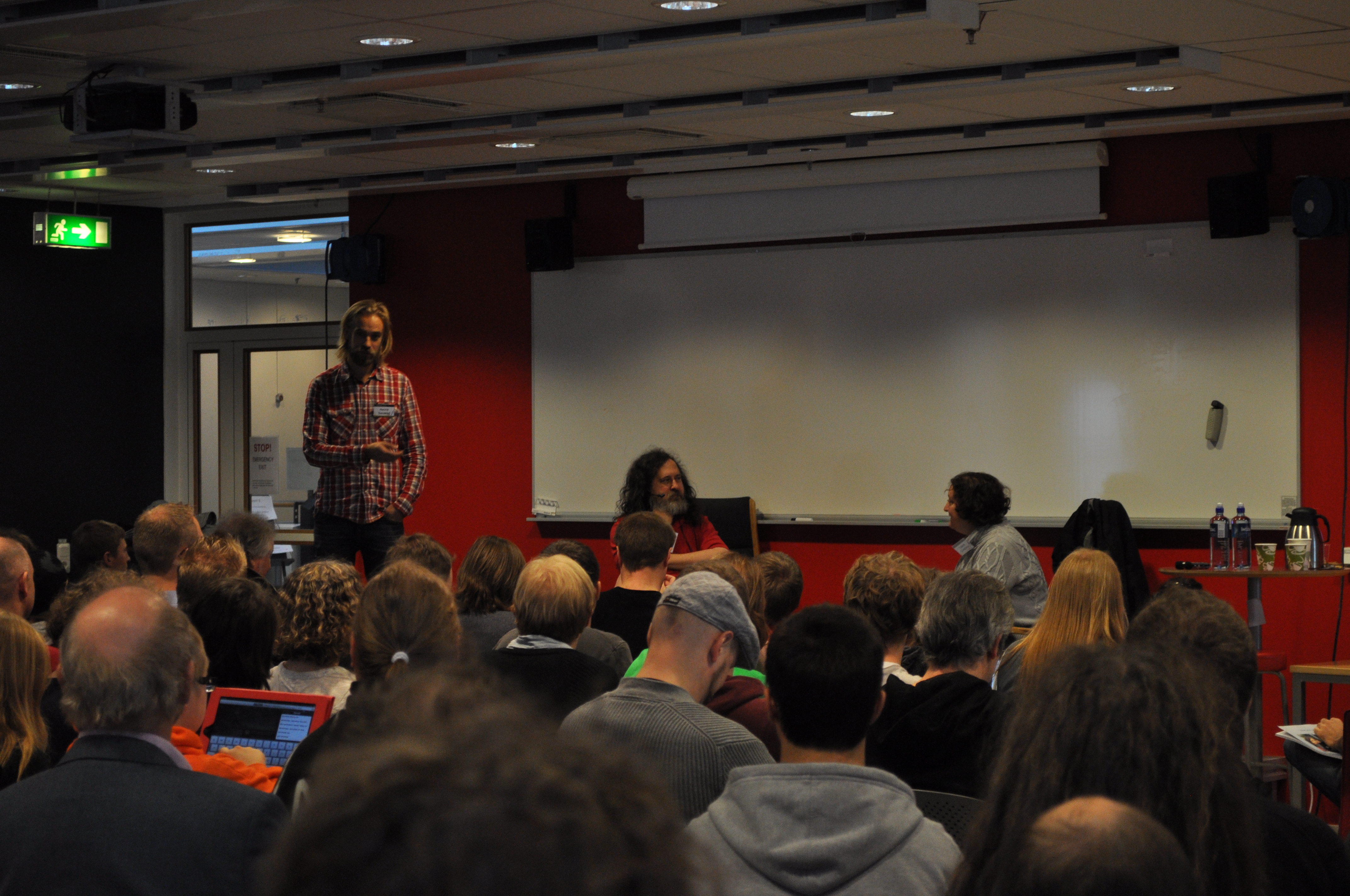FSCONS-arrangör Henrik Sandklef presenterar Richard Stallman som ska bli intervjuad av Laura Creighton.