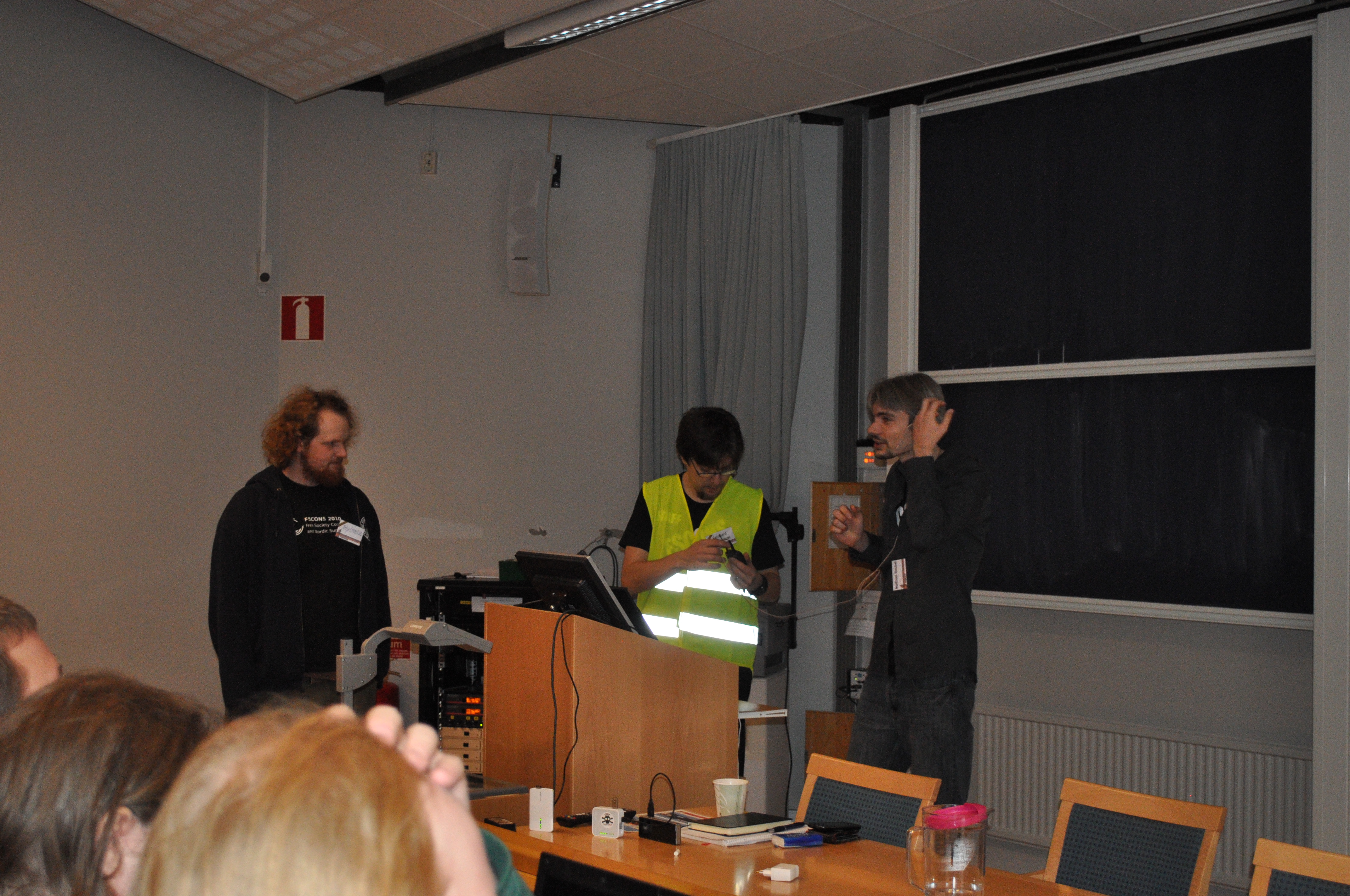 Matthias Strubel blir försedd med en mikrofon inför sitt föredrag om Piratebox.
