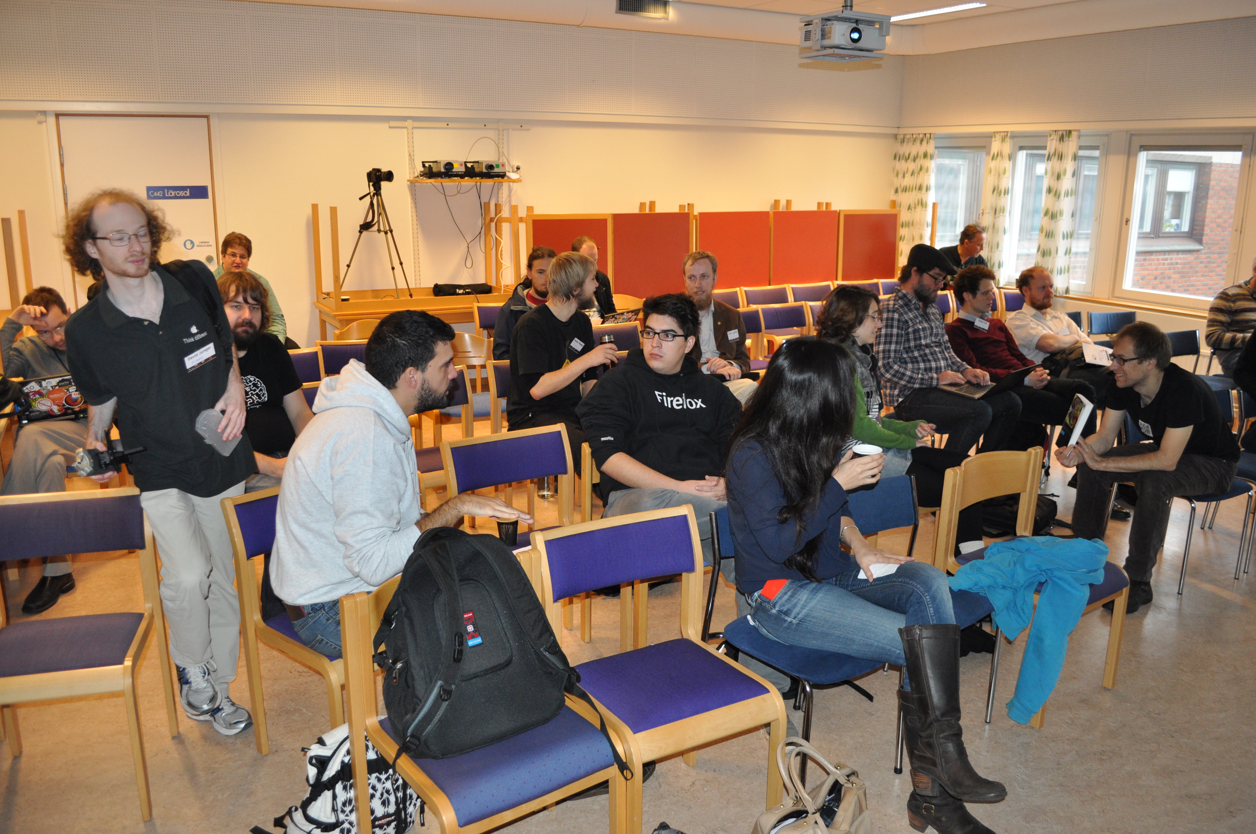 FSCONS-deltagare väntar för att lyssna på ett föredrag om hur datornördar gör motstånd mot viss ny datorteknik.